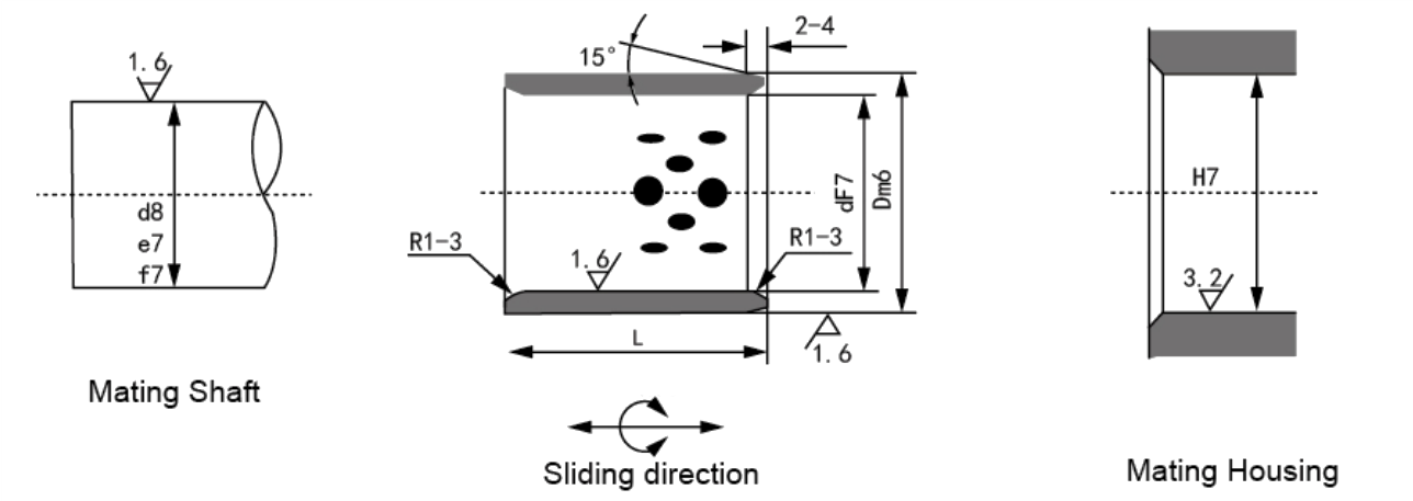 | JDB-3 | Materiál vnitřní strany výrobků řady JDB-3 je stejný jako materiál řady JDB-2. takže by mohly fungovat stejně dobře jako funkce řady JDB-2. v dodatečných. Mají další výhody, jako je úspora nákladů na materiál, zlepšení pevnosti v tlaku a to, že je lze sestavit svařením povrchu pouzdra s jinou matricí. Jsou vhodné pro díly, které nevyžadují olejové mazání stavebních strojů, hutních strojů a dopravních strojů. |